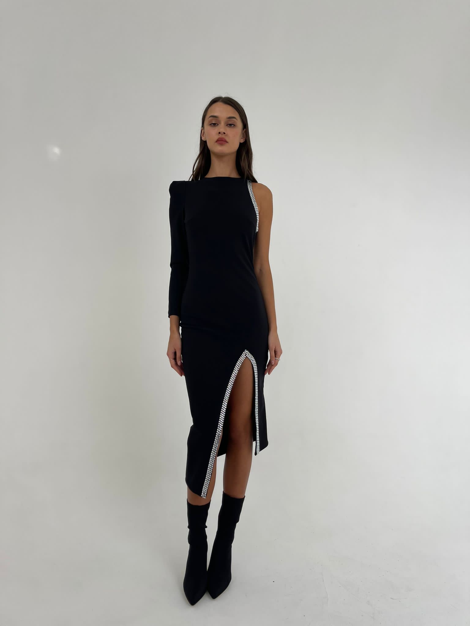 שמלת "מילר" מבד מחטב באורך מידי בגזרת שרוול אחד עם כרית כתף, שסע עמוק ודוגמת עיטורי אבנים בשסע ובקו הצוואר.
